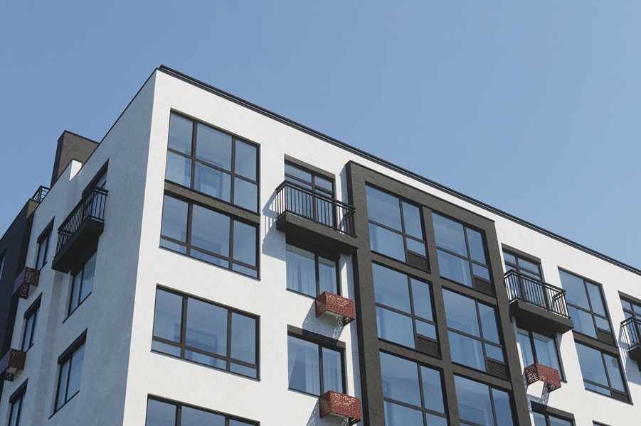Окна — однокамерный стеклопакет с покрытием Термофлот (покрытие, удерживающее тепло зимой, прохладу летом), цветной профиль с фасадной стороны (графитовый). Остекление лоджий — однокамерный стеклопакет, цветной профиль с фасадной стороны (графитовый).
