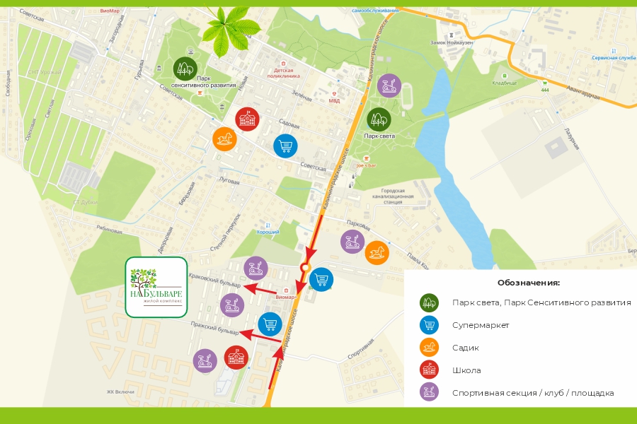 Удобная транспортная развязка позволит быстро добраться до нужного места. До побережья Балтийского моря всего 25 минут. Янтарный пляж, свежий бриз и хорошее настроение обеспечено. Всего 15 минут до Голубых озер. До центра самого западного региона России — города Калининграда — всего 15 минут. Всё это возможно благодаря удобным выездам к Большой Окружной дороге, Приморскому кольцу и Куршскому заливу.
