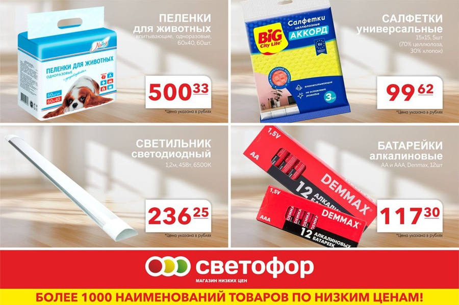 Направляясь в «Светофор», покупатели могут быть всегда уверены: здесь их ждет широкий выбор всевозможных товаров. Кстати, как раз в эти дни в сети существенное пополнение ассортимента и внушительный список новинок! Товары для дома и дачи, предметы личной гигиены, бытовая химия, корма для четвероногих питомцев — перечислять можно бесконечно... Вот лишь небольшая подборка: