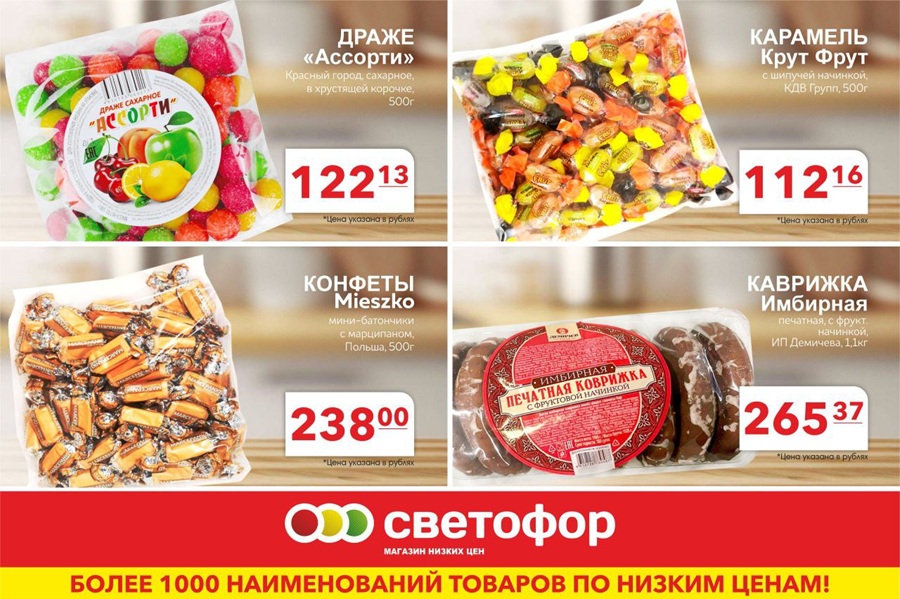 Традиционно «Светофор» приятно удивляет внушительным выбором продуктов: от «заморозки» и бакалеи до снеков, кондитерских изделий и всевозможных напитков на любой вкус. Естественно, по выгодным ценам.