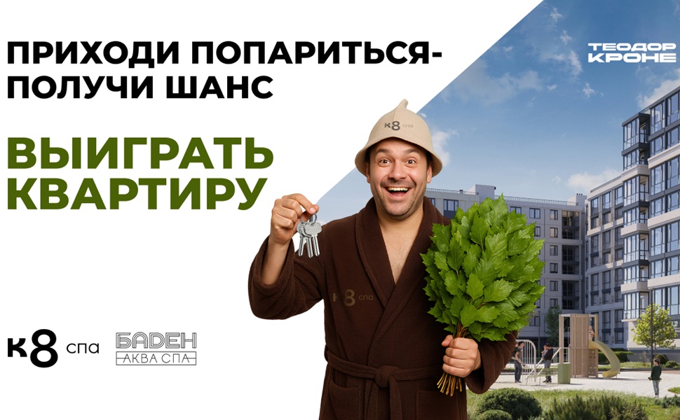 Крупнейшие спа-комплексы региона «K8 СПА» и «Баден Аква СПА» запустили масштабную новогоднюю акцию под брендом «K8 ДАРИТ». Главный приз — квартира* в строящемся ЖК «Теодор Кроне» в Калининграде.