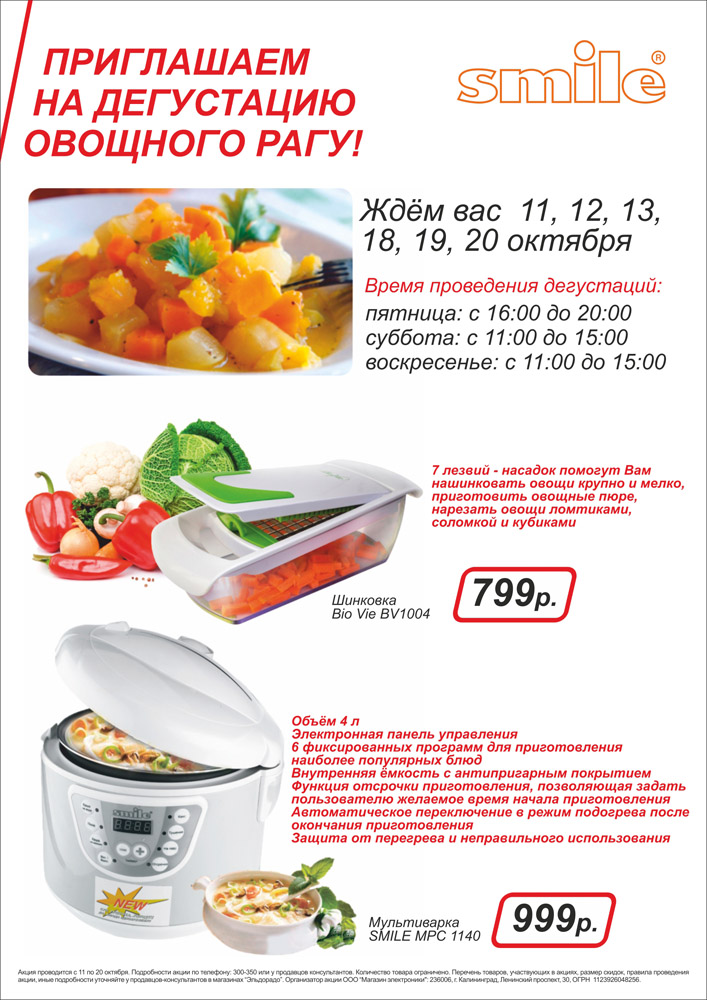 Оценить все достоинства мультиварки и многофункциональной терки в действии вы сможете на бесплатной дегустации овощного рагу, приготовленного в мультиварке SMILE MPC 1140 и шинковке Bio Vie BV1004.
