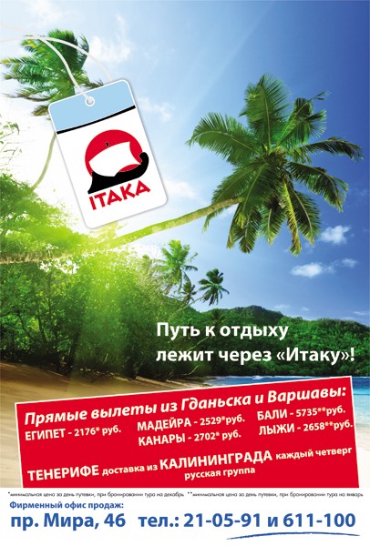 Второе предложение касается отдыха на море в теплых странах — это туры в Марокко, Египет, на Мадейру, а также в теплую экзотику — на Сейшелы, Бали, Шри-Ланку, в Кению, Венесуэлу и Доминиканскую республику. В последние три страны вылеты будут осуществляться самым современным самолетом Dreamliner, и это будут прямые рейсы, более быстрые и со значительно большим комфортом. А специальные цены с вылетом из Польши делают эти путешествия реально привлекательными для достаточно широкого круга калининградцев. Просто посмотрите наш сайт www.itaka.pl и убедитесь в этом.
