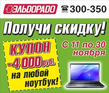 Только с 11 по 30 ноября! Предъявителю купона — скидка 4 000 рублей на покупку абсолютно любого ноутбука в магазине «Эльдорадо», расположенном по адресу: г. Калининград, ул. Уральская, 18, ТЦ «Мега Маркет», 3 этаж.