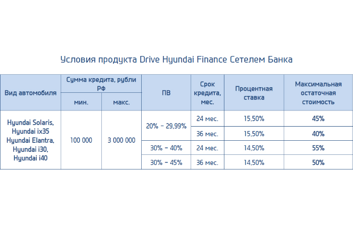 Новая программа Drive Hyundai Finance, разработанная «Хендэ Мотор СНГ» в партнерстве с «Сетелем Банком», предоставляет покупателям Hyundai возможность владеть автомобилем с существенно меньшими ежемесячными расходами по обслуживанию кредита.