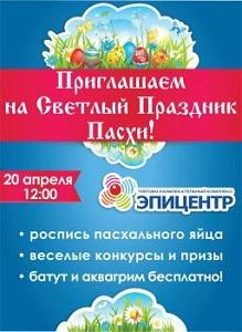 Торгово-развлекательный комплекс «Эпицентр» встречает светлый праздник Пасхи вместе с вами! Приходите 20 апреля на нашу площадь по адресу ул. Профессора Баранова, 30 и радуйтесь прекрасному дню. С 12 часов мы начинаем праздновать Воскресение Христово символической росписью большого яйца, в котором может принять участие каждый пришедший. Совместное действие сблизит наши сердца и подарит причастность к празднику каждому гостю. Вас ждут увлекательные конкурсы, ценные призы и разнообразные игры. Маленьких гостей порадуют бесплатный батут и аквагрим.