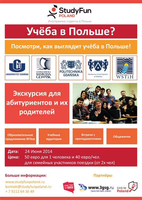 23 июня приглашаем абитуриентов и их родителей приехать в Польшу и посмотреть собственными глазами, как выглядят вузы Польши. Мы покажем вам учебные аудитории и общежития, представим учебные программы вузов, а также познакомим с преподавательским составом.