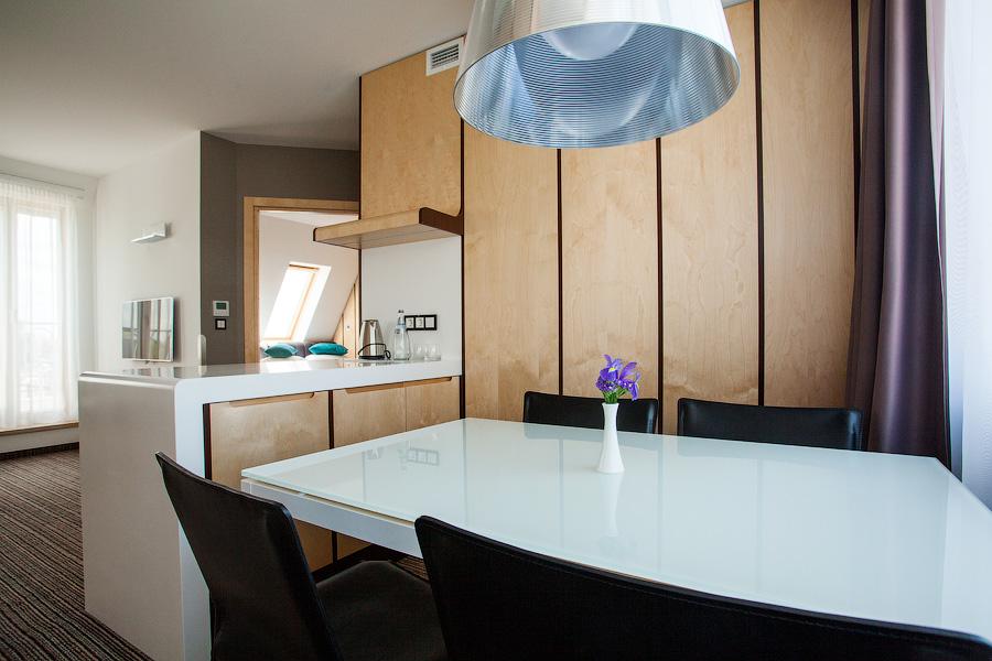 По словам литовских дизайнеров, проектировавших мебель и детали интерьера, таково было пожелание архитектора: море, камень, дерево — все должно естественно сочетаться. «Вот тогда мы начали искать такие материалы, которые будут смотреться гармонично и сегодня, и через десять лет, — говорит один из них. — К тому же технологически это очень трудный проект: я когда увидел, что нам нужно изготовить, час думал, что это невозможно сделать, но потом посоветовались с конструкторами своими и сделали». В результате ни одного номера, похожего на другой, в отеле нет — каждый фактически проектировался индивидуально.