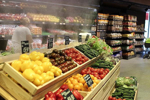 - Только здесь покупатели могут увидеть в работе систему орошения. В течение дня каждые 8 минут в воздух над стеллажом с овощами и фруктами выбрасывается распыленный поток воды (около 600 мг), который увлажняет их, оседая, тут же испаряется. После орошения на овощах и фруктах не остается никаких следов или влаги, а они надолго сохранят свежесть и вкус.