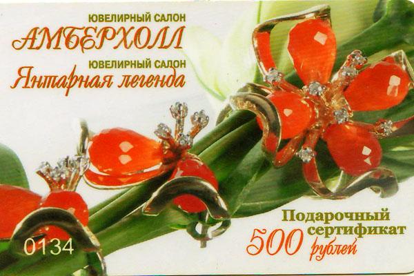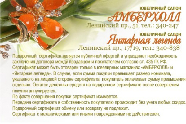 В ювелирных салонах «Амберхолл» (Ленинский пр., 51, тел. 340247) и «Янтарная легенда» (Ленинский пр., 17/19, тел. 340838) можно эти сертификаты приобрести, а получатель сертификата сам выбирает желанный и нужный подарок!