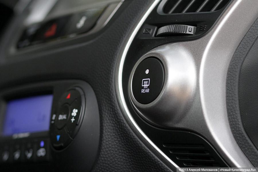 С настройкой зеркал проблем не возникло: они управляются джойстиком, расположенным на ручке водительской двери (и умеют складываться при необходимости — для этого предусмотрена отдельная кнопка), — да и с уровнем удобства у Hyundai ix35 все в порядке. И водителю, и пассажирам в кроссовере вполне комфортно. Кстати, помимо привычного широкого подлокотника со скрывающимися в нем подстаканниками, в распоряжении задних пассажиров находятся кнопки управления подогревом сидений — как говорится, мелочь, но приятно.