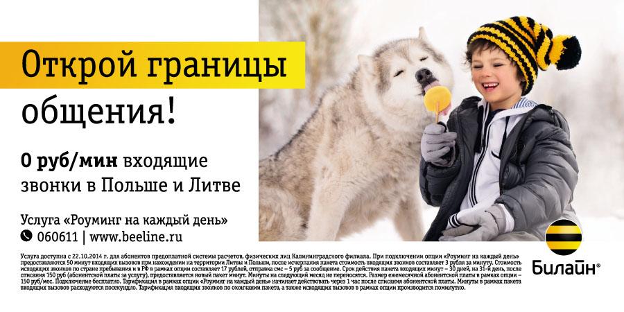 Калининградский филиал ОАО «ВымпелКом» (бренд «Билайн») предлагает существенно сэкономить на мобильной связи в поездках по Литве и Польше с новой пакетной опцией «Роуминг на каждый день». Предложение разработано специально для жителей Калининградской области.