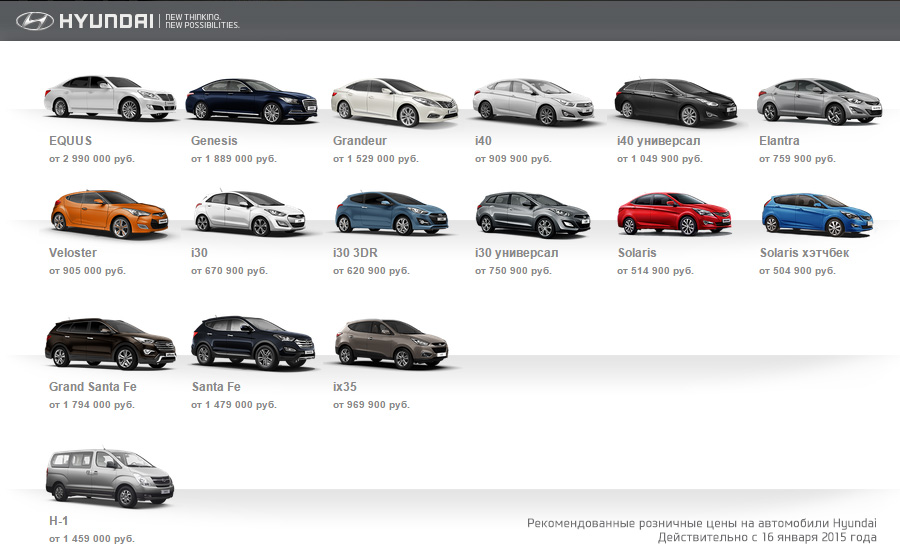 В январе произошёл ожидаемый и, к сожалению, неизбежный рост цен. Автомобили 2015 года выпуска подросли в цене на сумму от 35 до 95 тысяч рублей, в зависимости от модели. Например, полюбившийся калининградцам Solaris сейчас можно приобрести по цене от 504 900 рублей, а компактный кроссовер ix35 — от 969 900 рублей».