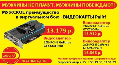 Именно поэтому специалисты «Санрайз-Визард» решили помочь нашим виртуальным воинам именно к Дню защитника Отечества! В магазины поступили новейшие видеокарты Palit, которые помогут получить максимальное превосходство в любой виртуальной битве! Спешите в «Санрайз-Визард». Таких боеприпасов много не бывает!