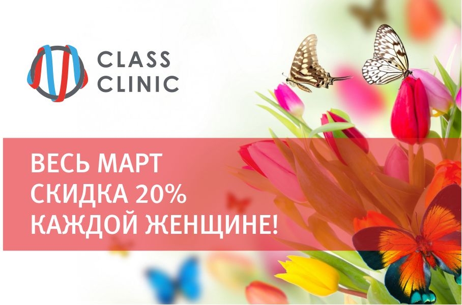 В честь Международного женского дня в медицинском центре «Class Clinic» в Калининграде проходит акция: с 1 по 31 марта каждая женщина получает скидку 20% на приём во всех отделениях у всех врачей, кроме УЗИ.