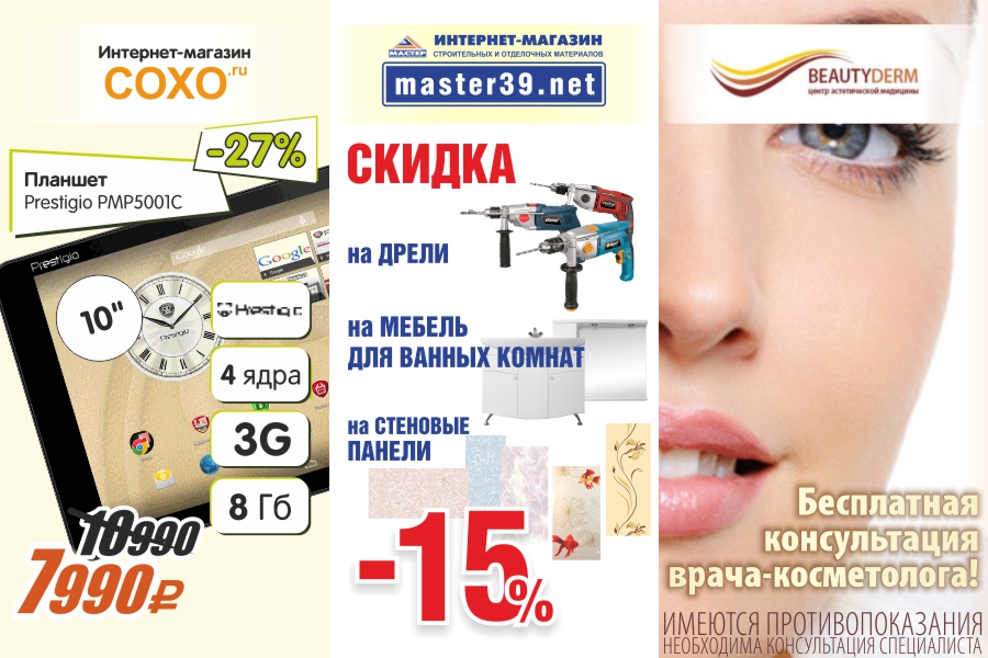 Весенняя акция во всех магазинах «Сохо» в Калининграде и области! Смартфон — 4 590 рублей, планшет с 3G — 7 990 рублей, телевизор с диагональю 32'' — 13 490 рублей, ноутбук — 14 990 рублей, стиральная машина — 12 990 рублей, холодильник — 14 990 рублей, газовая поверхность + духовой шкаф — 16 990 рублей. 22 товара по акции с ценами и характеристиками — на сайте «Акция39.ру» http://akciya39.ru/coxo. Всегда выгодные предложения на сотни товаров — на сайте http://www.coxo.ru.