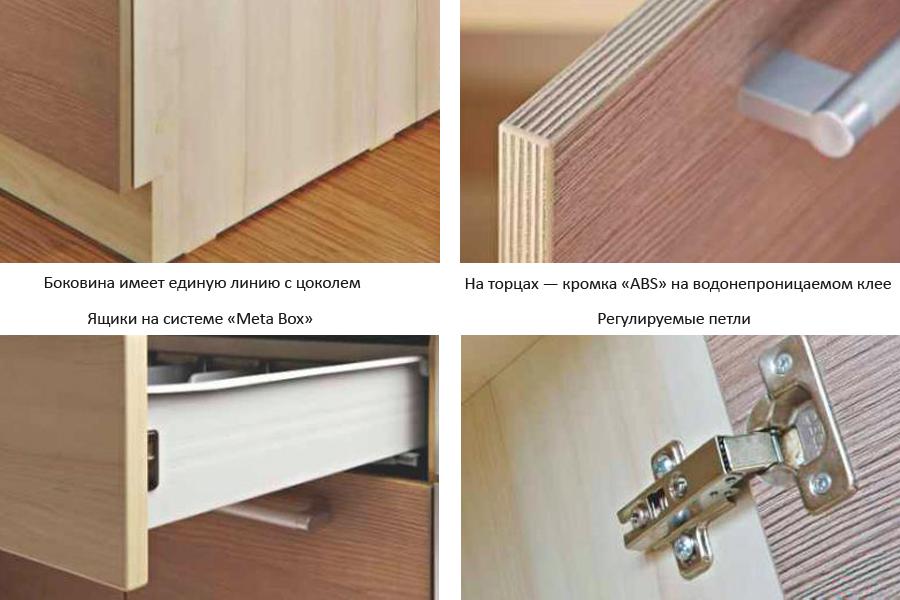 Все кухни, даже бюджетные коллекции, снабжены механизмами мягкого закрытия дверей и ящиков. Все коллекции снабжены столешницами с толщиной 38 мм и износостойким покрытием.