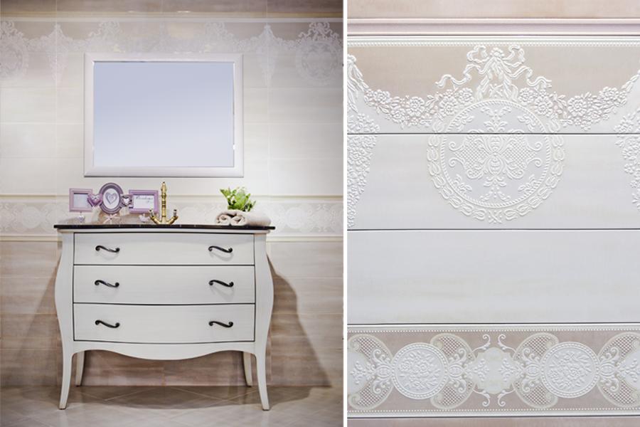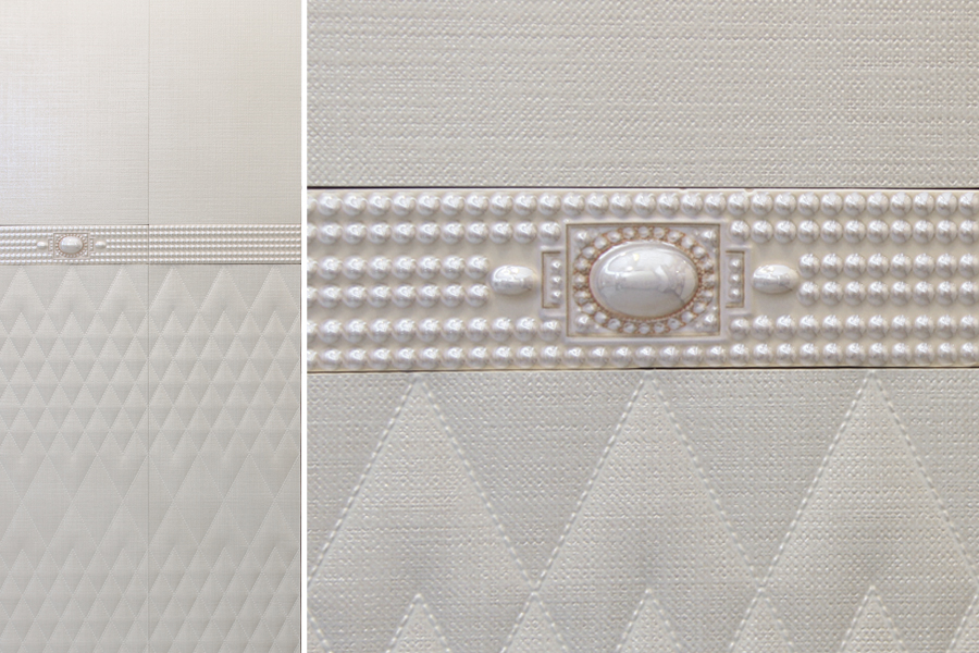 Впечатлила меня коллекция „Jewel“, созданная по мотивам древнеримской керамики… Эта плитка будто переносит тебя в пространство древнеримских терм и, кстати, идеально подойдет для оформления ванных комнат в величественном римском стиле, гармонирующем как с классическими, так и с современными интерьерами. Величие в простом, так свойственное древнеримскому искусству, находит здесь отражение в витиеватых аутентичных узорах, которые складываются из простых и понятных геометрических форм. А напыление цвета золота и нежные пастельные тона делают эту плитку теплой и уютной.