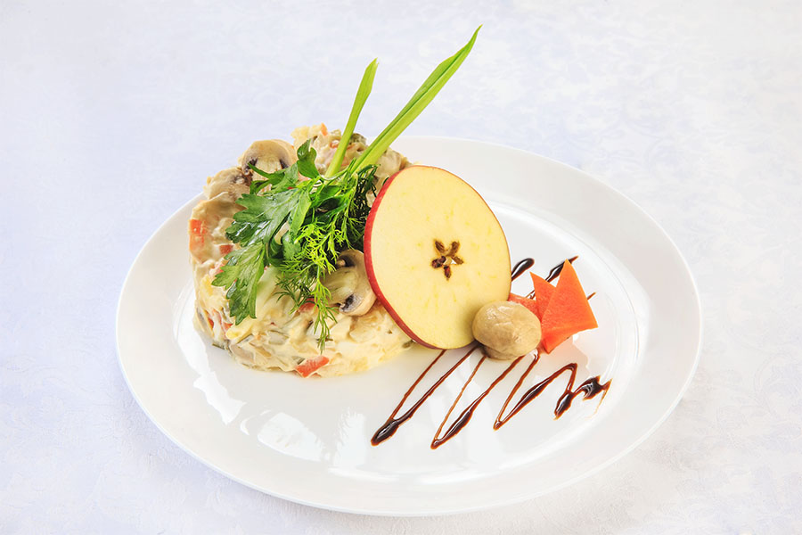 Кроме того, вашему вниманию предлагается вполне традиционный салат Оливье, но в неожиданном исполнении. Для него вам потребуется: грибы свежие «Натурово» (300 г), варёный картофель в мундире «Натурово» (500 г), огурцы солёные «Натурово» (300 г), морковь варёная «Натурово» (1 шт.), репчатый лук (1 шт.) и майонез.