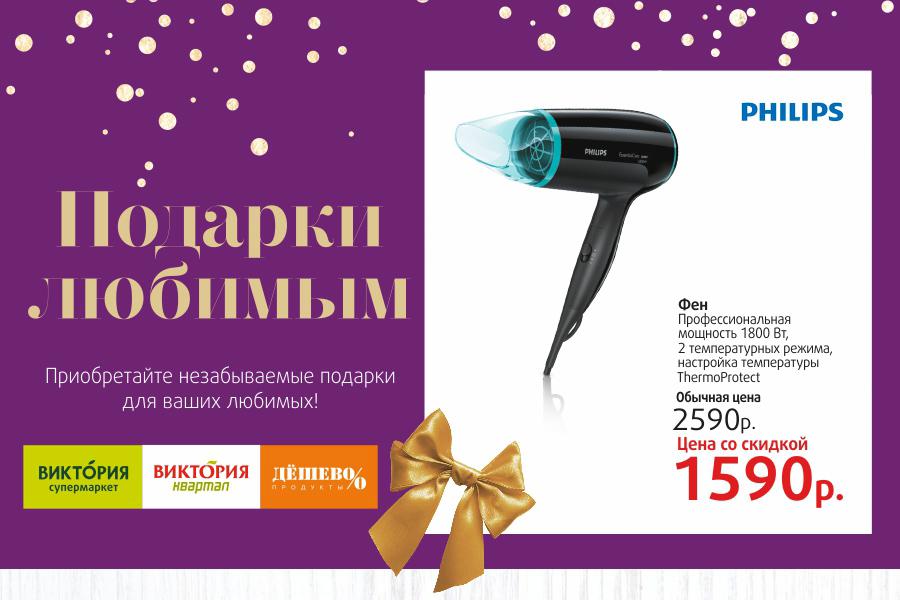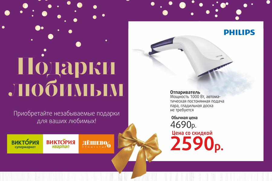 Каждый, кто в период с 10 февраля по 20 марта 2016 года совершит покупку на сумму от 800 рублей в сети «Виктория», получит подарочный купон, который позволит до 22 марта 2016 года приобрести подарочную технику «Phillips» со скидкой до 50%!
