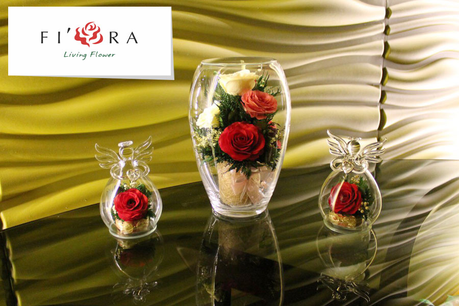 «Fi’ora» — это композиции, изготовленные из собранных в Тайланде живых цветов, которые сохраняют свою природную красоту и яркость долгие годы. Благодаря особой технологии производства, не требующей химической обработки, цветы в стекле будут радовать вас около 5 лет. Важно подчеркнуть, что процесс создания такой композиции — от выращивания растений до составления букетов — это профессиональная ручная работа. А стеклянный сосуд, в котором располагается композиция, благодаря оптическому увеличению подчеркивает изящество цветов и придает всей композиции элегантный и утонченный вид.