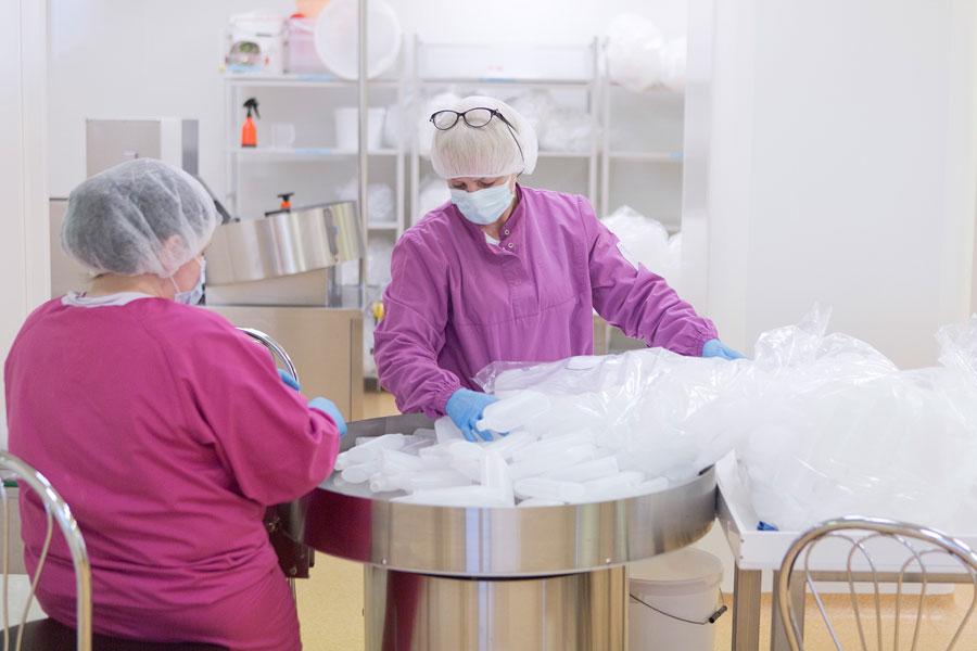 На самые «секретные» участки производства не попасть, но вот процесс розлива и упаковки препарата посетителям показывают охотно. Пластиковая тара приезжает сюда стерильной, укутанной сразу в два мешка. Смена на заводе длится 12 часов, и за это время с конвейера сходит 60 тыс флаконов «Мирамистина» и примерно столько же «Окомистина».