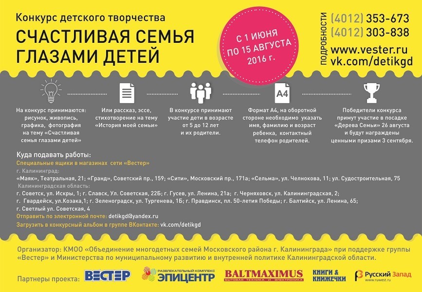 Организаторы акции: «КМОО «Объединение многодетных семей Московского района г. Калининграда», председатель Правления Болычев О. Н., при поддержке группы «Вестер» и Министерства по муниципальному развитию и внутренней политике Калининградской области»