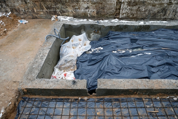 Первое, что понимаем, оказавшись на месте, — это вне всяких сомнений строительная площадка. На снегу — свежие следы тяжелой техники и отпечатки тяжелых ботинок, фундамент частично залит бетоном, местами виднеется свежая кирпичная кладка, торчат пластиковые выводы коммуникаций, в сторону крутого обрыва тянется дренажная канава.
