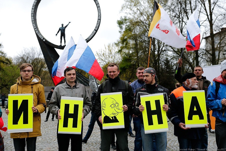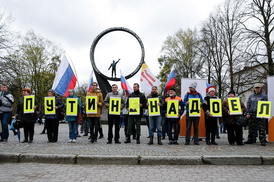 В субботу, 29 апреля, в Калининграде прошла протестная акция «Надоел». Ее инициатором стало незарегистрированное движение «Открытая Россия», созданное Михаилом Ходорковским, оппозиционным политиком и бывшим главой компании ЮКОС. Смысл акции состоял в том, чтобы напомнить гражданам России о заложенном в Конституции принципе сменяемости власти и публично заявить о недоверии президенту Владимиру Путину. На пикет, связанный с акцией, в Калининграде пришло около 70 человек.