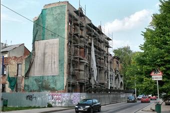 Напомним, что эти дома были построены после 1900 года. После войны здания использовались под жильё, но в 1987 году были расселены для проведения капитального ремонта. Ремонт так и не был проведен, в настоящее время оставшаяся лицевая стена с надписью Kreuz-Apotek продолжает разрушаться.