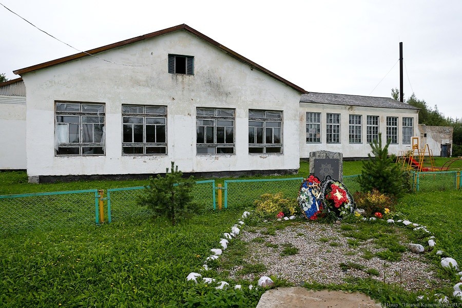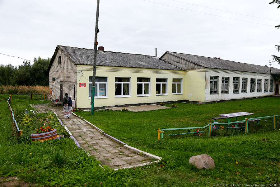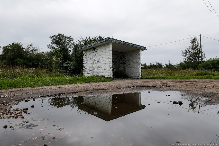 Дорога пустынная — складывается ощущение, будто в этот забытый богом уголок мало кто ездит в принципе. Однако сам посёлок выглядит вполне ухоженным — в нём есть целых два магазина, дома покрашены в яркие краски, во дворах — веселые фигурки лебедей, вырезанные из старых шин. По улицам гуляют гуси, куры и утки, во дворах лают собаки. Типичный для калининградской глубинки поселок.