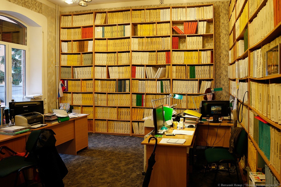 На улице льет дождь, ветер несет мокрые листья, мы заскакиваем в здание из красного кирпича, расположенное неподалеку от Королевских ворот. Здесь находится региональное общество слепых, библиотека — на первом этаже. «В такую погоду слепые на улицу не выходят: скользко и опасно», — говорит нам директор Татьяна Трубина. Она встречает нас у входа, мы проходим по безлюдным коридорам мимо помещений, заставленных стеллажами.