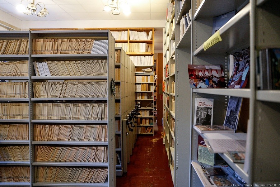 «Видите, у нас с лампочками проблема — не горят, падает напряжение. Здание очень старое, немецкое, многое пришло в негодность. Но „плюс“ здесь — высокие потолки. И мы умудряемся распихнуть свои фонды. 200 метров здесь, и еще наверху хранилище есть. Конечно, очень удобно, что у нас стремянки. Мы всегда в форме».