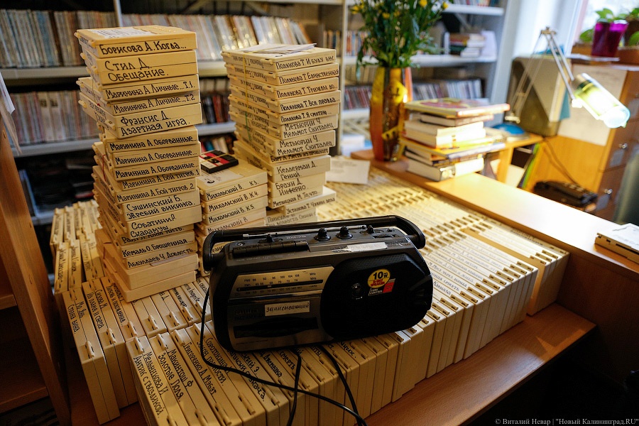 На полках тесными рядами стоят книги, отпечатанные шрифтом Брайля, и коробочки, похожие на книги: внутри находятся аудиокассеты. Пленка бельгийская, поэтому кассеты, которые, казалось бы, давно должны отправиться на покой, в отличном состоянии.
