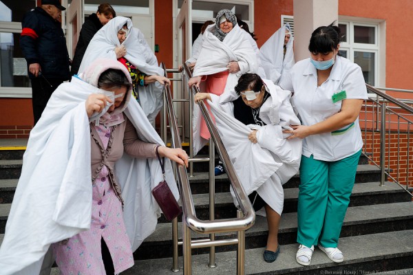 В пятницу спасатели вывели из отделения микрохирургии глаза областной больницы всех пациентов. В здании проходили пожарные учения, которые предполагали эвакуацию людей. По легенде, пожар начался на втором этаже корпуса микрохирургии глаза, где в момент условного возгорания находились реальные пациенты стационара. «Пострадавших» эвакуировали через окна, в том числе и на пожарный батут. Но тут пациентов пожалели и использовали манекены. За работой пожарных, полетами манекенов и страданиями пациентов наблюдал фотокорреспондент «Нового Калининграда».