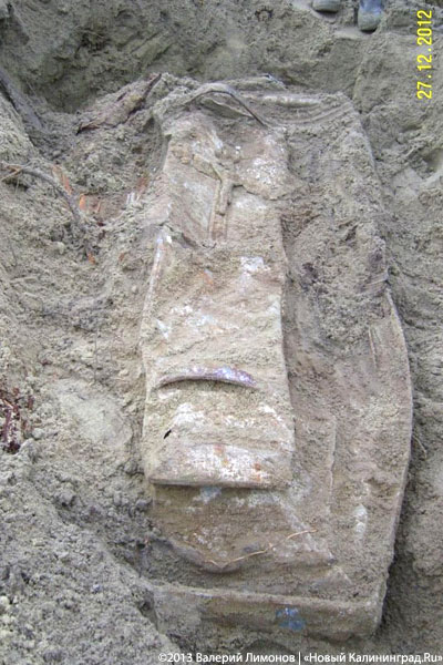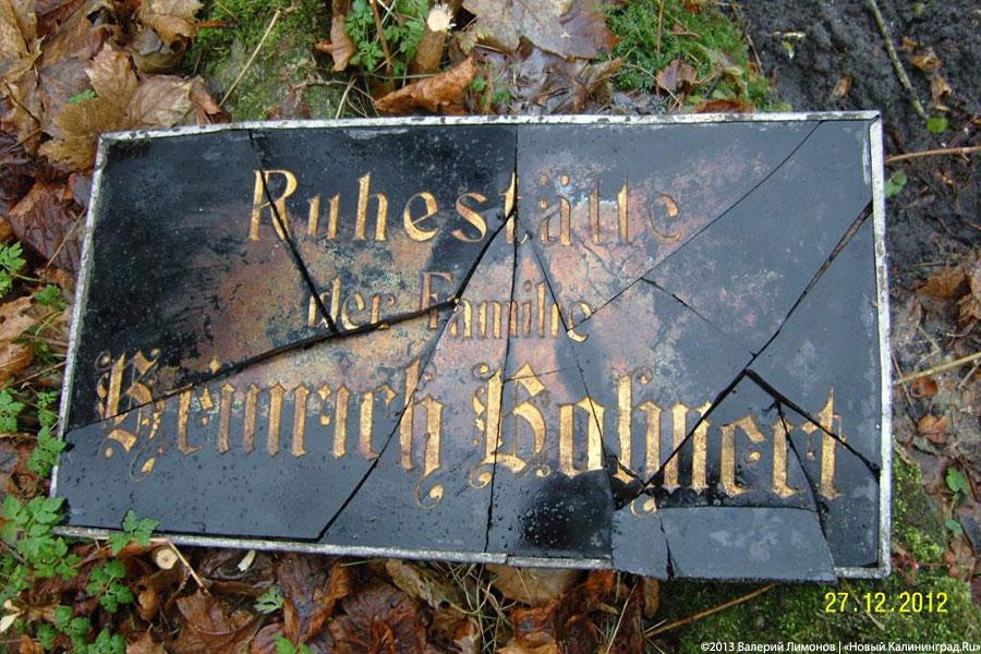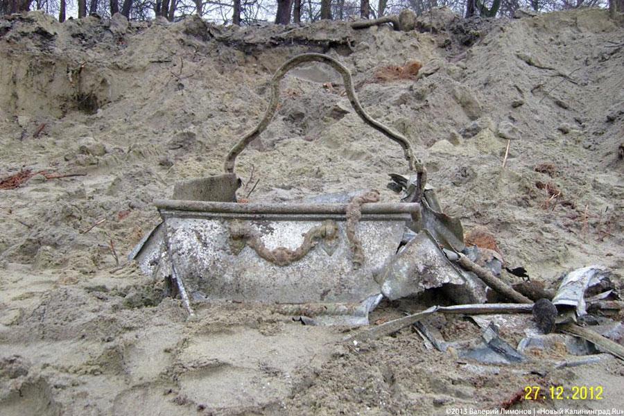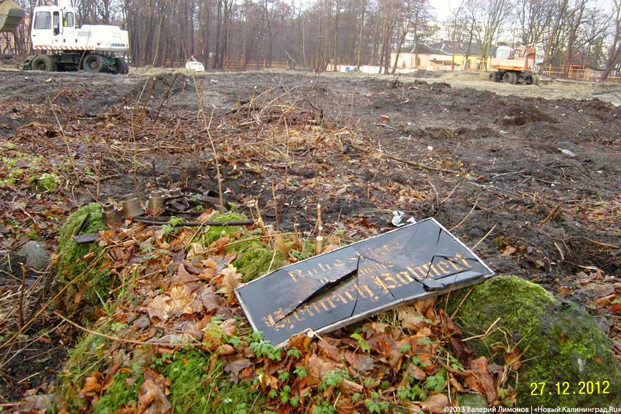Директор фонда исторических исследований сообщил, что до 1945 года на месте стройплощадки было городское кладбище, на котором, в том числе, были похоронены почетные жители бывшего Пиллау. «В 50-х годах с кладбища вывезли надгробия и свалили их в том месте, где сейчас находится аквапарк. Надгробия были обнаружены во время строительства аквапарка, — добавил Валерий Лимонов. — Долгое время на месте бывшего кладбища в центре города был сквер».
