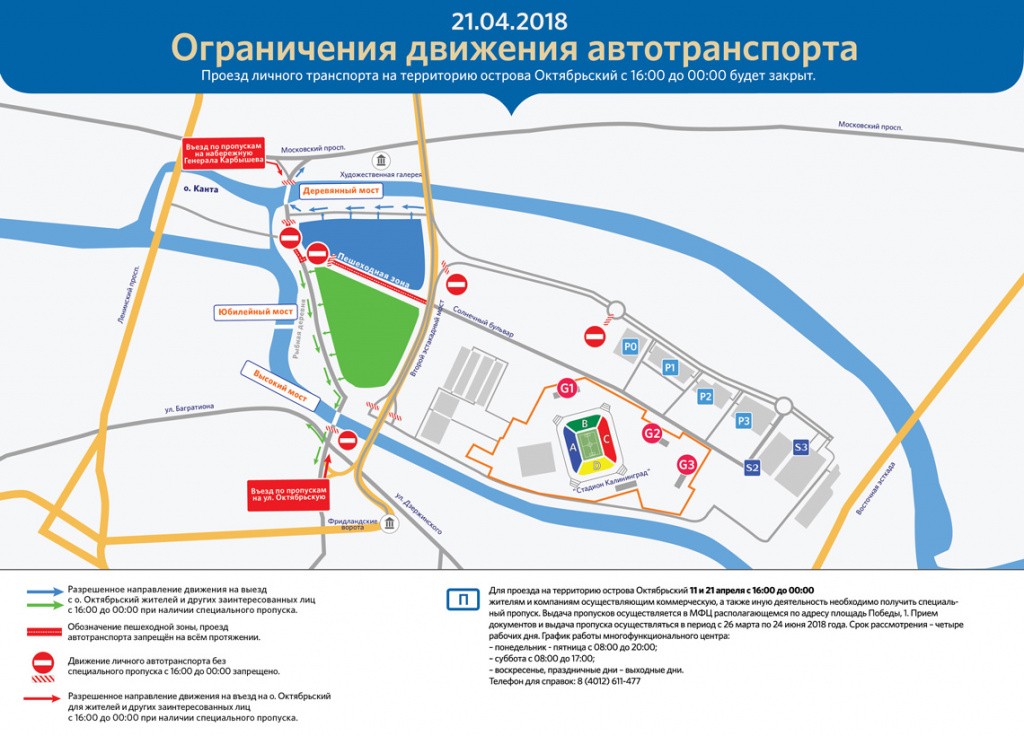 По данным мэрии, как и во время первого тестового матча,перекрывать будут ул. Октябрьскую на участке от Московского проспекта до ул. Багратиона. Солнечный бульвар на всем протяжении; мост через реки Старая и Новая Преголя по направлению движения от ул. Дзержинского; съезд № 1 и 4 с моста через реки Старая и Новая Преголя на остров Октябрьский.