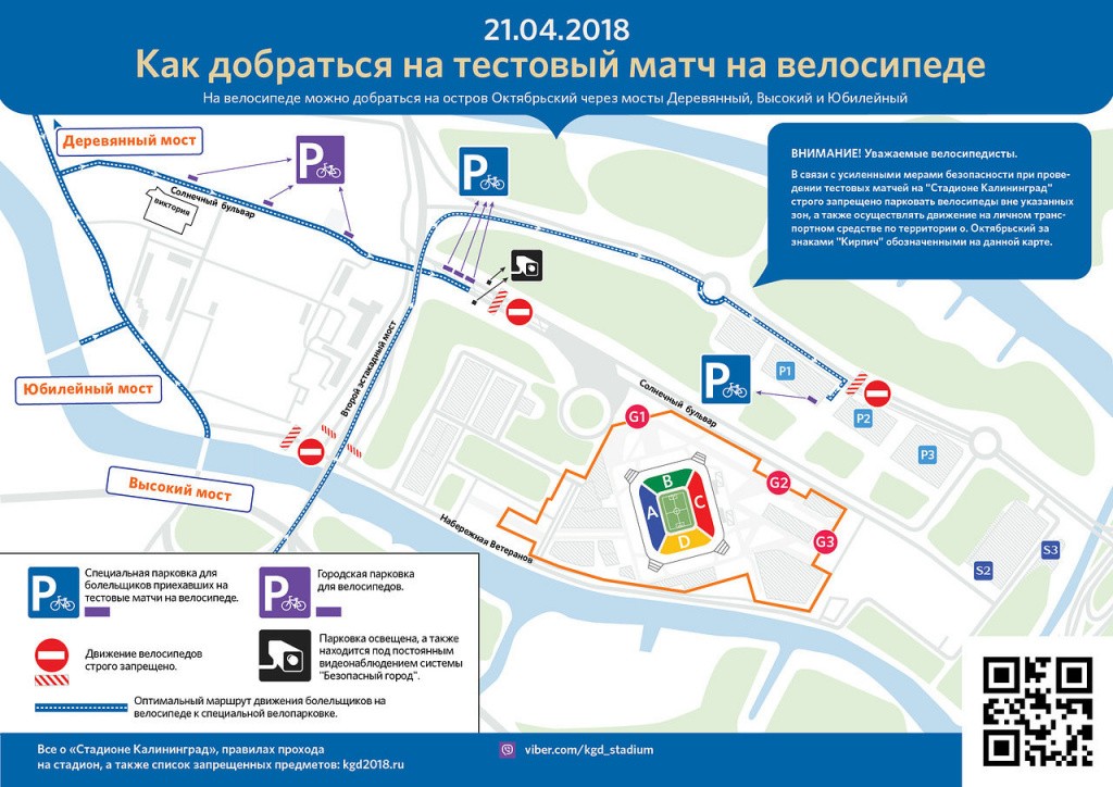 В субботу, 21 апреля, при проведении второго тестового матча по футболу на стадионе «Калининград» с 16:00 до 00:00 планируется перекрытие улиц на острове Октябрьском. Его жители смогут попасть на своём автотранспорте домой по пропускам, а болельщики — добраться непосредственно до стадиона пешком или на специальных шаттлах. Для велосипедистов на этот раз обещают велопарковки.