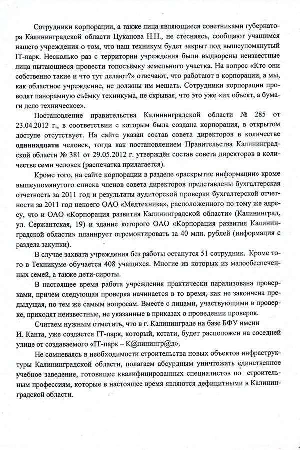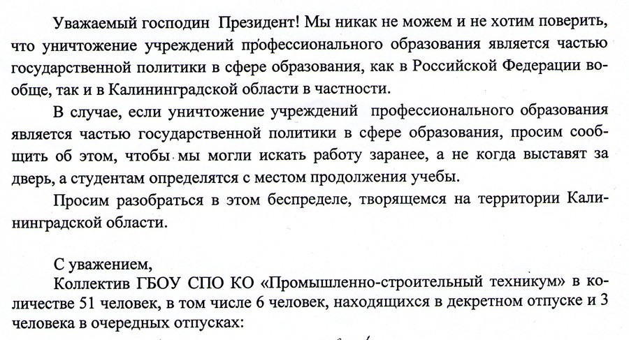 В письме говорится, что в случае захвата учреждения без работы останется 51 сотрудник. Кроме того, в техникуме обучается 408 учащихся, в том числе из малообеспеченных семей и дети-сироты. «Не сомневаясь в необходимости строительства новых объектов инфраструктуры Калининградской области, полагаем абсурдным уничтожать единственное учебное учреждение, готовящее квалифицированных специалистов по строительным профессиям, которые в настоящее время являются дефицитными в регионе, — говорится в письме. — Уважаемый господин Президент! Мы никак не можем и не хотим поверить, что уничтожение профессионального образования является частью государственной политики в сфере образования». Педагоги просят Путина разобраться в «творящемся беспределе».