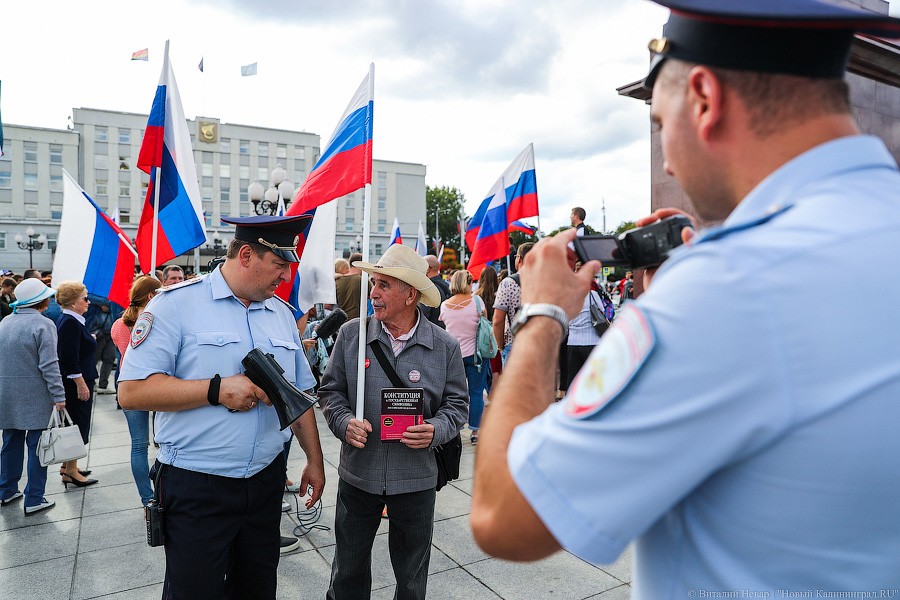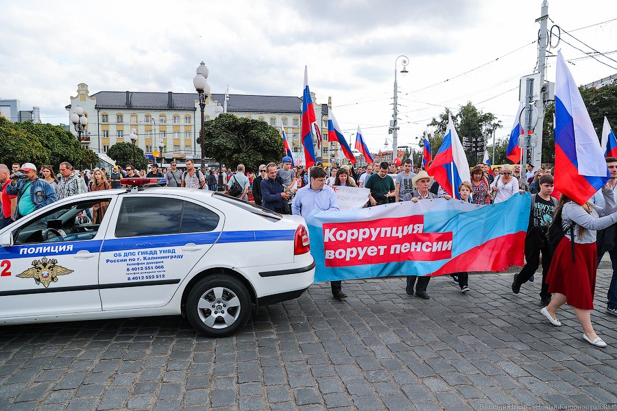 Один митинг против повышения пенсионного возраста, организованный штабом Навального в Калининграде, уже проходил — тогда он собрал примерно две сотни человек, а мероприятие было согласовано с мэрией. На этот раз глава Калининграда Алексей Силанов протестную акцию штабу Навального не согласовал. В ответе горадминистрации пояснялось, что полицейские не смогут обеспечить безопасность её участников, так как будут следить за правопорядком на выборах. Однако уже за полчаса до начала анонсированного митинга на стоянке у Центральной площади стоял автобус, набитый сотрудниками ППС. Там же был припаркован почти десяток легковых автомобилей с сидящими в них полицейскими разных чинов.