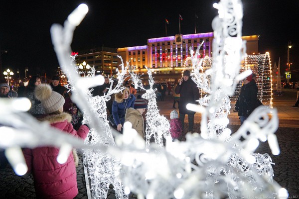 На площади Победы в Калининграде на полную мощность включили праздничную иллюминацию. Впервые за долгие годы центр города украсили светящимися фигурами. Новшество горожане оценили и охотно фотографируются с яркими арками, елочными шарами и упряжками. Иногда калининградцы проявляют даже излишнее рвение, норовя оседлать светящийся олений каркас и открутить на память с уха