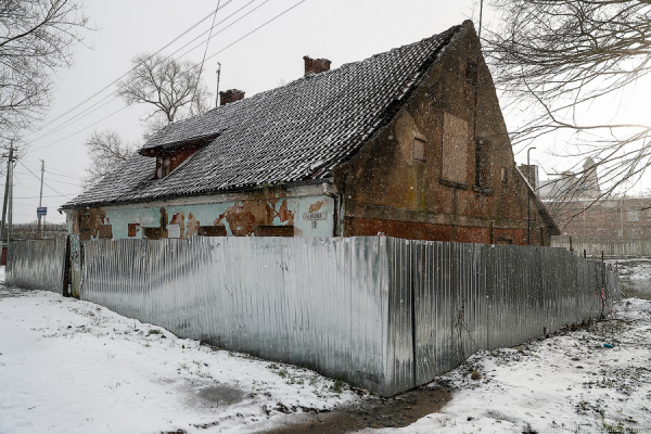 Памятник регионального значения «Дом, в котором жил художник Ловис Коринт, 1825 года» идеально вписывается в свое депрессивное окружение. Волны полуобвалившейся черепицы, наглухо заколоченные фанерными листами окна, глубокие трещины на фасаде, уведомление о расселении дома, приколоченное слева над деревянной дверью с остатками советской синей краски. Изжеванный металлический забор украшают выцветшие бумажные лошадки, на которых еще можно разобрать имена «Олеся» или «Леша».