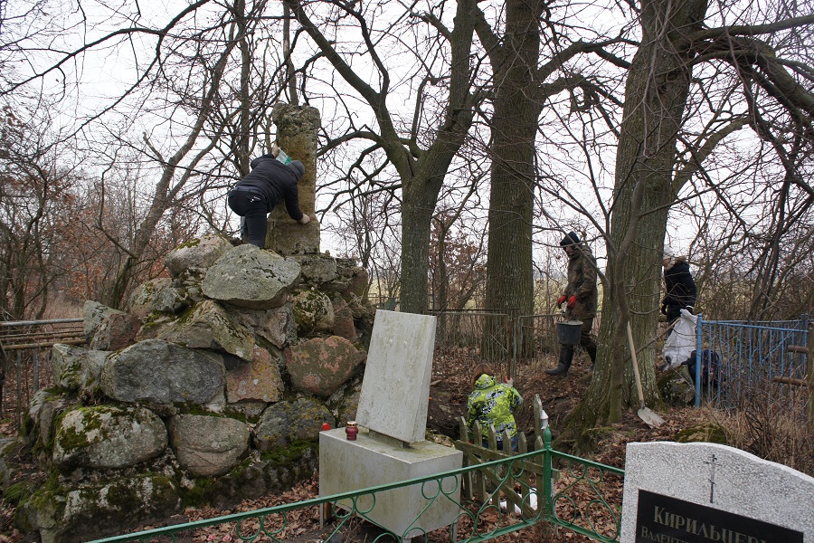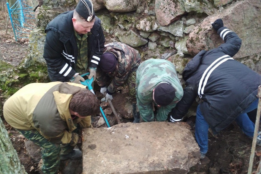 Наша задача — заполнить яму для того, чтобы памятник перестал в нее съезжать. Сделать это нужно с помощью камней (тех, что можно поднять вручную: сейчас техника сюда уже не подъедет) и грунта; позже зеленоградская администрация обещает подвезти щебенку и песок, чтобы заполнить пустоты. Еще нужно расчистить от кустарника проход к памятнику (точнее, к могилам, между которыми можно пробраться к стеле) и установить стенды, доказывающие, что происходившее здесь