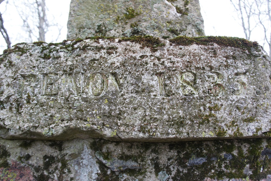 В советские годы часть основания разрушили, очевидно, не обошлось без тяжелой техники. Вручную сделать подобное было бы невозможно: камни весом в несколько сотен килограммов лежат в радиусе метров 20. Сейчас «выгрызена» половина, а то и две трети постамента, некогда сделанного из валунов и цементного раствора. Наверху возвышаются остатки каменной стелы. С лицевой ее стороны выбито: Schlacht bei Rudau, 1370 (Битва при Рудау, 1370), с обратной — Renov 1835 (восстановлен в 1835). Надписи читаются довольно легко; после того, как стелу очистили от мха и помыли — совсем легко. Более того, сбоку основания на плите тоже проступает надпись Renov irt 1870: очевидно, что памятник приводили в порядок в XIX веке дважды.