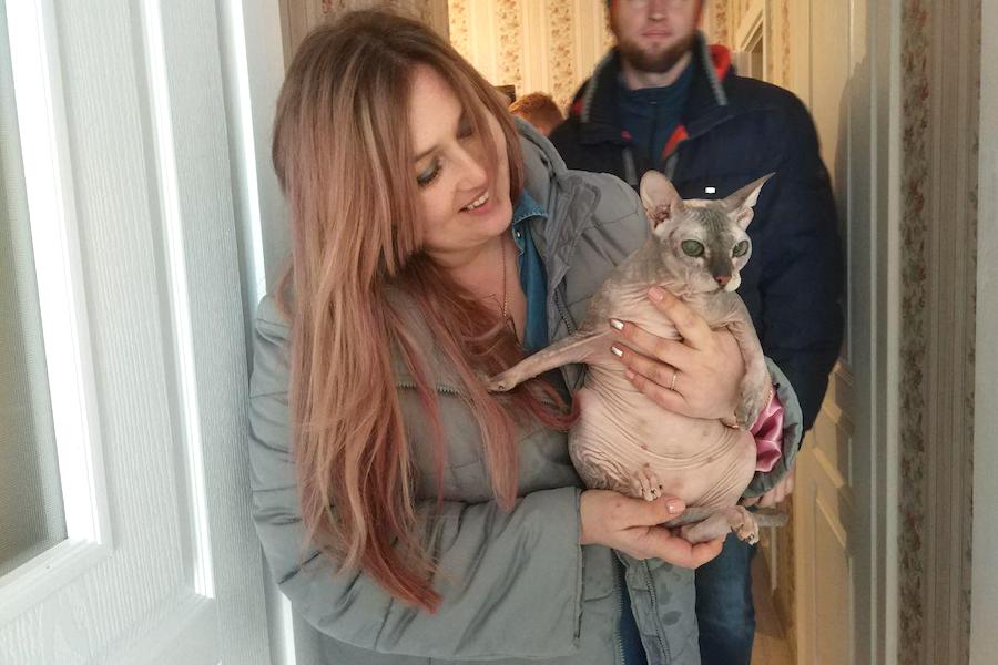 Вручение ключей тоже не обошлось без некоторой режиссуры. В новую квартиру торжественно внесли хозяйского котика, сфинкса Клеопатру. Пока гости пили шампанское в комнате, обалдевшая от наплыва людей в пиджаках животина, сверкая квадратными очами, пыталась отдышаться на руках хозяйки на кухне.