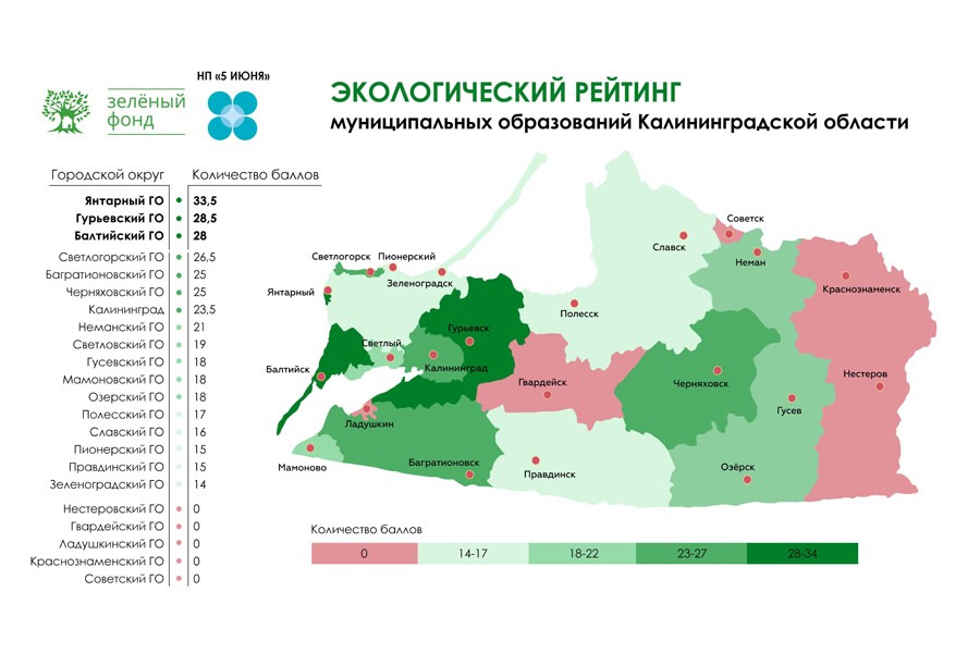 Назначив каждому муниципалитету по всем этим критериям баллы, а потом сложив их, авторы рейтинга в итоге выяснили, где в регионе к экологии самое чуткое отношение. На первом месте оказался Янтарный (33,5 балла), дальше — Гурьевск (28,5) и Балтийск (28). А вообще оказалось, что самый «зеленый» у нас запад области. За исключением Гвардейска, более-менее дела обстоят в центре. И хуже всего — на востоке, в Краснознаменске и Нестерове.
