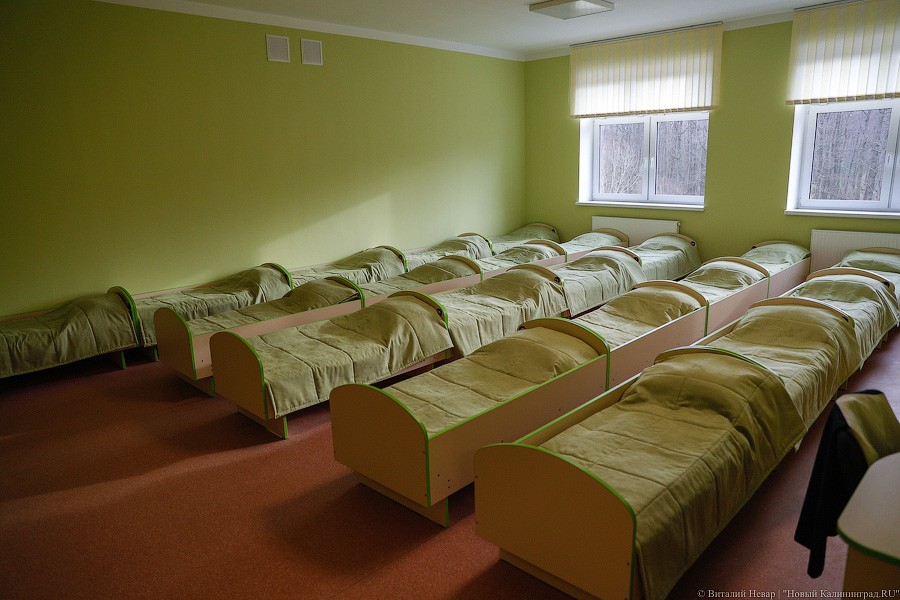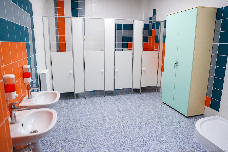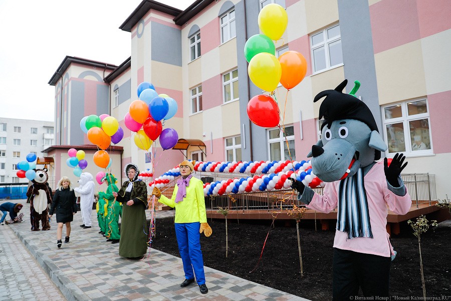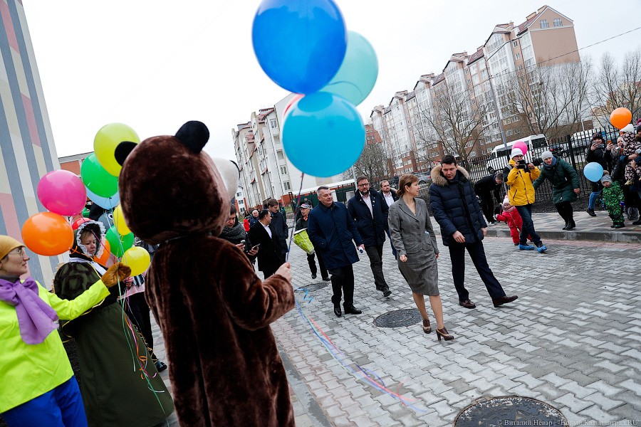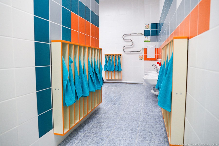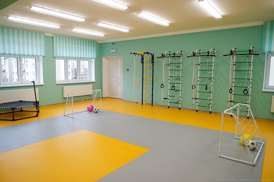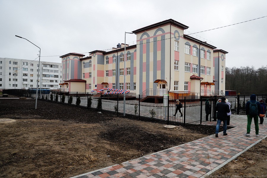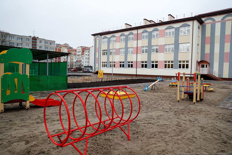 Садик рассчитан на 185 мест, в нем 9 групп, три из них ясельные (это сейчас обязательное требование, а не приятный бонус), спортивный и актовый залы, бассейна нет, — словом, ничего необычного, но мило и уютно. Приятные пастельные тона фасада (через полгода привычно облезет, как и большинство приятных фасадов социальных строек), типовые детские площадки (как в анекдоте про поддельные воздушные шарики, которые выглядят настоящими, но радости не приносят), традиционная плитка везде, где только можно (частично разъедется, но можно же заменить), и так далее. Это первый детсад, построенный в Зеленоградске за последние 38 лет, скажет позднее Алиханов. Потребность, мягко говоря, назрела, учитывая оглушительные темпы жилищного строительства в городке у моря в последние пару лет.