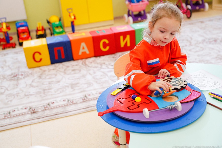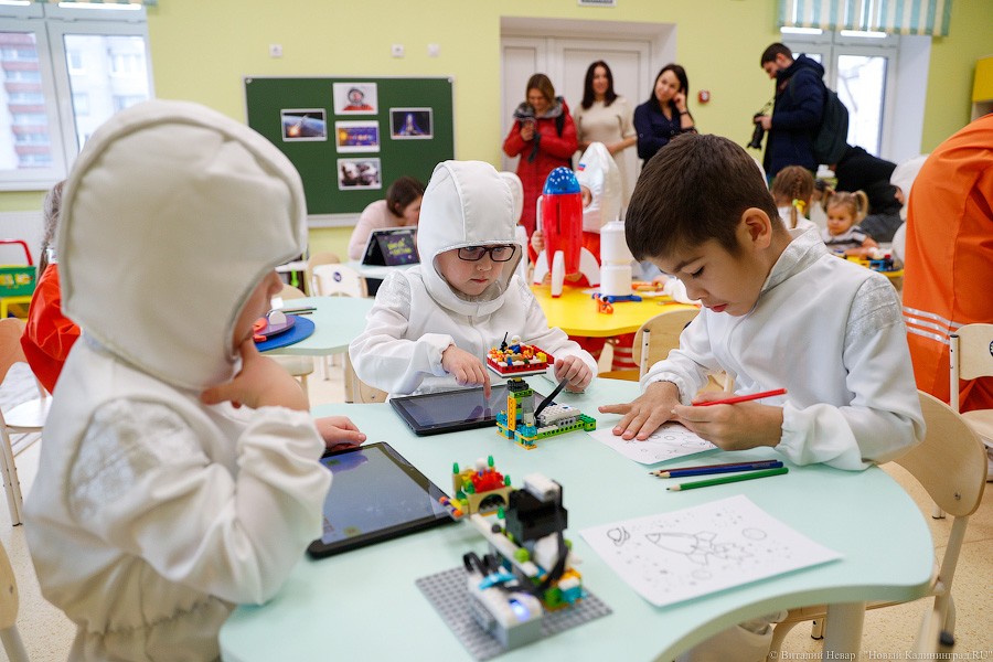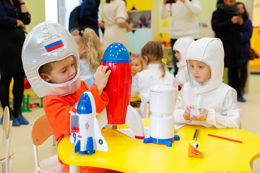 В одной из детсадовских групп с моделями космических кораблей и прочими тематическими конструкторами возятся дети в странных колпачках — небольшое насилие над воображением позволяет опознать в них шлемы космонавтов. За их спинами — выложенное из кубиков слово «спасибо». На «президенту и губернатору» кубиков, видимо, не хватило. Группы тематические, объясняют странные наряды детей воспитатели — это «космонавты» и им положены космические игрушки.