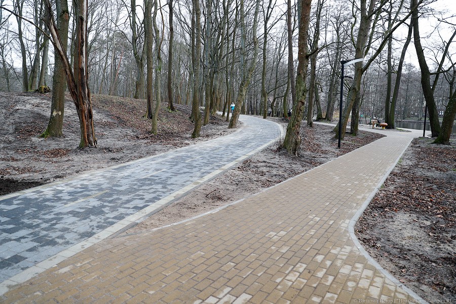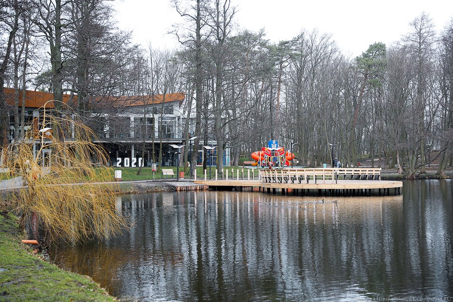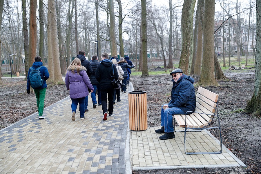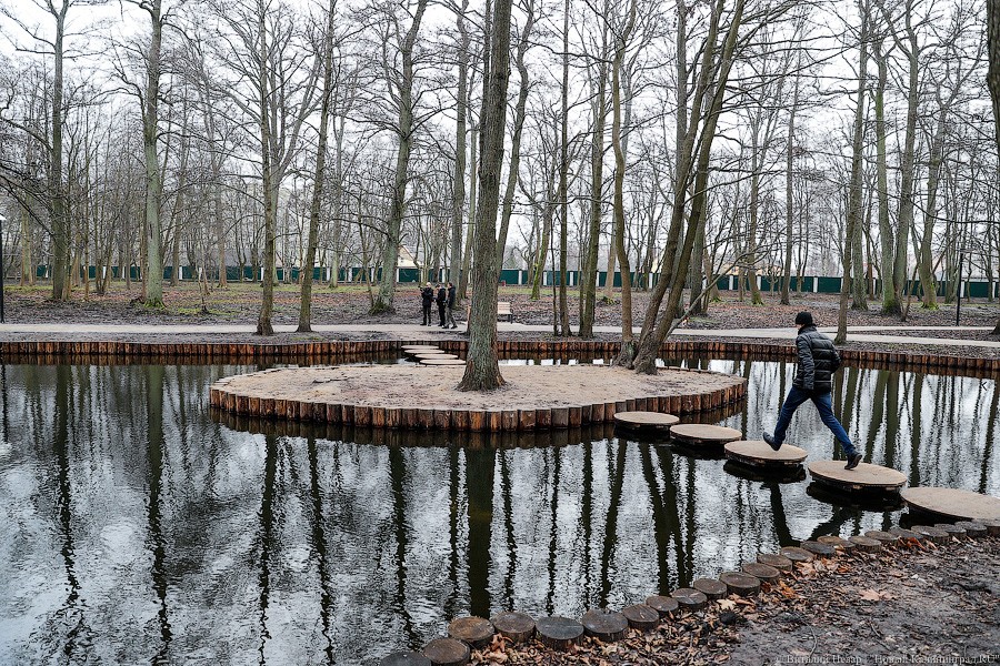 От кладбища делегация бежит через городской парк, где недавно завершилось благоустройство стоимостью в 21 млн бюджетных рублей. В парке появились пирс, мостики через каналы (местами весьма необычные), освещение, дорожки и прочие атрибуты комфортной среды. Глаз не очень радуют пока только газоны с лужами и черной землей, но для садовых работ, конечно, еще не сезон.
