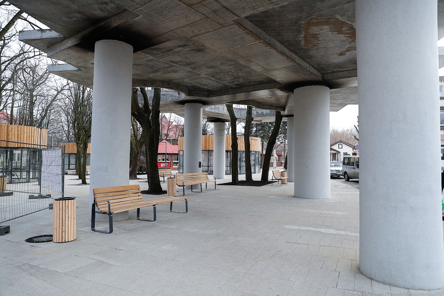 На автобусной остановке напротив вокзала теперь высится монструозного вида навес от непогоды с трогательными дырочками для деревьев, которые решено сохранить. Конструкция задумывалась металлической, но в целях безопасности ее заменили ее на более надежную железобетонную. «Она снизу будет обшиваться деревом, рейками из лиственницы, колонны планируется облицевать глянцевой керамической плиткой. <...> Чтобы обшить навес, должен был „встать“ бетон. И эти все работы немножко отложились. Я думаю, что в течение месяца все будет завершено», — объясняет главный архитектор причины нетоварного облика навеса.